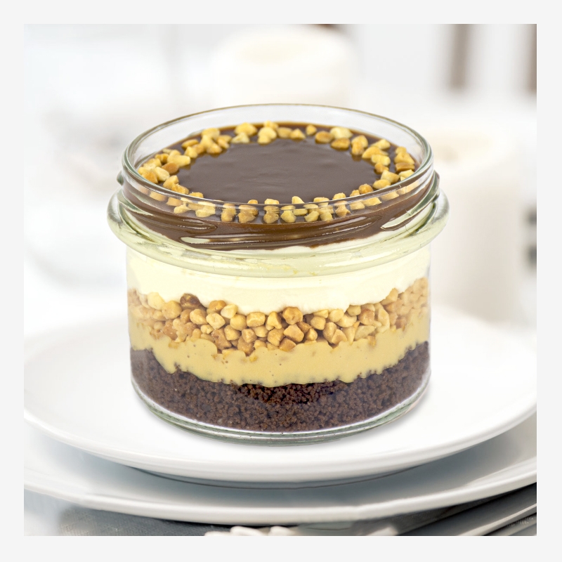 Aromat karmelu i orzechów unosi się jeszcze przed spróbowaniem. Czekoladowe ciastka stanowią bazę dla kolejnych pysznych elementów. Masa kajmakowa nadaje słodyczy i wyjątkowego charakteru tej propozycji. Drobno pokrojone orzeszki ziemne podkreślają precyzję wykonania deseru. Bita śmietana i czekoladowa glazura to niezwykłe wykończenie stanowiące o umiejętnościach cukiernika. Miłośnicy połączenia orzechów z czekoladą będą oczarowani tym deserem!