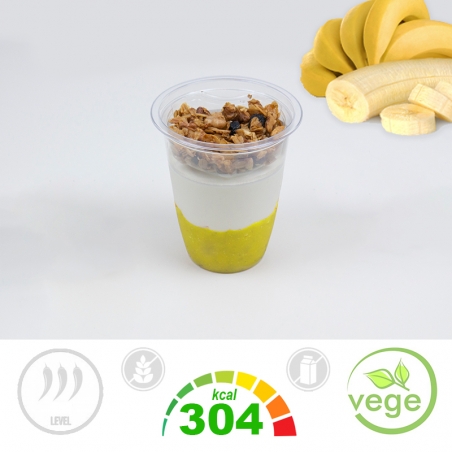 Składniki: Jogurt grecki (70,4%) (Jogurt grecki (Z MLEKA)), Puree bananowe (19,4%) (banan), Granola (10,3%) (Granola (Pełnoziarniste płatki OWSIANE, Mąka (JĘCZMIENNA, mąka kukurydziana), grys kukurydziany, mieszanka owoców w zmiennych proporcjach [rodzynka (rodzynka, olej roślinny), chips bananowy (olej kokosowy, cukier trzcinowy, aromat miodu), ananas kandyzowany (ananas, cukier trzcinowy, regulator kwasowości: kwas cytrynowy), żurawina suszona słodzona, jabłko suszone], nierafinowany cukier trzcinowy, nieutwardzony tłuszcz palmowy, syrop glukozowy, melasa trzcinowa, płatki kokosowe, sól morska, aromat, emulgator: lecytyny (Z SOI), cynamon, ekstrakt słodu JĘCZMIENNEGO)).